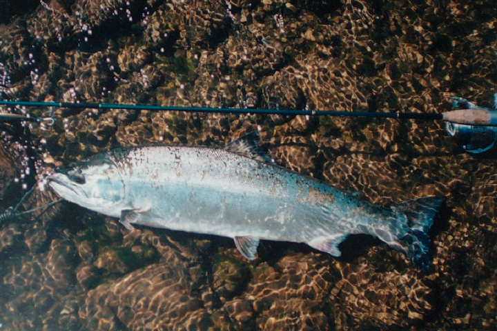 ルアー・フライ・餌釣りのジャンルにかかわらず、サクラマスや大型トラウトなど中下流域の大型魚を狙う人が増えてきた。渓流を卒業し、毎年新たな魚が遡上してくる本流を目指す人が増えるのは上流の混雑解消のためにもいい傾向だ。太い糸を使っていても体ごと引っ張られるような、あのサクラマスのパワーを体験したら、40センチ以下の渓魚はパーマーク(幼魚紋)が示す様に降海型の子供みたいな物である。しかし、渓流で尺物を狙って数を競っているうちは理解できない人がほとんどなので、納得いくまで釣って悟った後の方がいい。小物には一切構わず、滅多に釣れない大物を狙ったり、キャッチ&リリースまで到達するのに要する時間は人それぞれ違うものだ。また、サクラマスを釣ると心に誓ったのに果たせず、コンスタントな釣果を得られる釣りに戻る人もいるが、毎釣行ボーズを馬鹿にされても諦めずに狙い続けた人にはほとんどヒットしているし、大きく美しいその魚を見ただけで、他の小物釣りと次元が違う事を分かってくれる。 1999年の赤川は1月31日に初物57センチが釣れたらしいが2月も散発的にしか上がらず、3月の本番を迎えた。過去のデータでも前年が好調の次の年はあまりよくないようである。さらに、赤川のある山形県庄内地方は平年に比べて大雪で3月になっても吹雪いて寒い日が多かった。4〜5月は持ち直したので漁協への平成11年度登録総数は170匹程度と、なんとか平年並みだったが、総体的に小型が多かった。 [3月15日] 大好きな袖浦橋で私の初ヒットはシュガーディープ金赤9センチでヒットした47センチ2キロの太ったアメマスであった。 [4月12日] 高速道下で60センチ級サクラマスをバラしてしまった。 [4月19日] 水量・水色とも今年1番の好条件で、今度こそと意気込んで新川橋下に立った。午前5時30分ハヤがボイルのように逃げ惑っていると思ったら20メートル程下流でドッボーン、と重々しい鯉のようなライズが始まった。すかさずライズリングの1メートル位下流へ目立つ金赤のミディアムディープをキャスト、シェイキングしながら波紋の真ん中で止めると一発でザバッときた。水面に渦巻きができたような巨大なローリングから4連続ジャンプで姿を現した魚は太い雄のサクラマスでヤッターと思いながらも捕れるか不安になる。魚は凄いスピードでジグザグを描きながら下流に走ったので少しドラグを締めたら急にハンドルが軽くなった。しまったバレたか、と思って急いでラインを巻き取ると何と上流に向かって来ていて私の目の前4〜5メートルでイルカのように空中で半回転ジャンプ、間違いなく70センチ級の超大物だ。そしてローリングやダッシュを繰り返した後で再びラインを引き出しグイグイ走る、まずいことにその先には川柳の水没したブッシュがあるため、止まらないドラグが不安になってきて、さらに締めた。やっとラインが止まったところで水面で暴れてから底の方で首を振っていたのを最後に感触が消え、戻ってきたミノーを見てやっとバレたのに気付き放心状態になっていたら目の前で大きくジャンプし気配が無くなった。振り返ってみるとこの時の魚は多分キングサーモンだと思う。この後、対岸の人に60センチ級がヒット。さらに釣友の松浦氏に59センチのフレッシュランがヒット。 [5月3日] 前回の魚が頭から離れず、新川橋下で夜明けとともにキャストを始めたが、焦りが前に出過ぎさせたのか、右足を踏み外し首まで水に入り瀬頭から瀬尻の巻き込みまで200メートルぐらい流されてルアーケースで重いベストと背中のランディングネットの水圧とウエーダーで浮いてしまう足でロッドを持って泳ぐことの難しさを体験した。その後、気を取直して河口と高速道下で粘ったが駄目だったので三川橋上流に10時少し前に移動した。そこには先行者が3人いたが左岸側が1人だったので、その「鶴岡の後藤氏」にお願いして入れてもらうことが出来た。時間的にみて何人もチャレンジした後だろうなどと思いながら川に入る途中ライズを発見、このポイントで実績のある金黒カラーをセットし、3投目でうまくライズリングに的中したのでシェイキングを5〜6回したらググッと重くなりゆっくり2度合わせをしたところ30メートルぐらい下流で水面が割れサクラマスが躍り出た。待望のヒットだ。前回70センチ級で贅沢なシミュレーションをしていたので、冷静に対処することができて3〜4回走られたが5分程でランディングした。ヒットタイム10時ジャスト、3度目の正直で手にした魚は、62センチ3・4キロのグッドコンディションの雌のサクラマスだった。これで今年もボーズは免れた。
