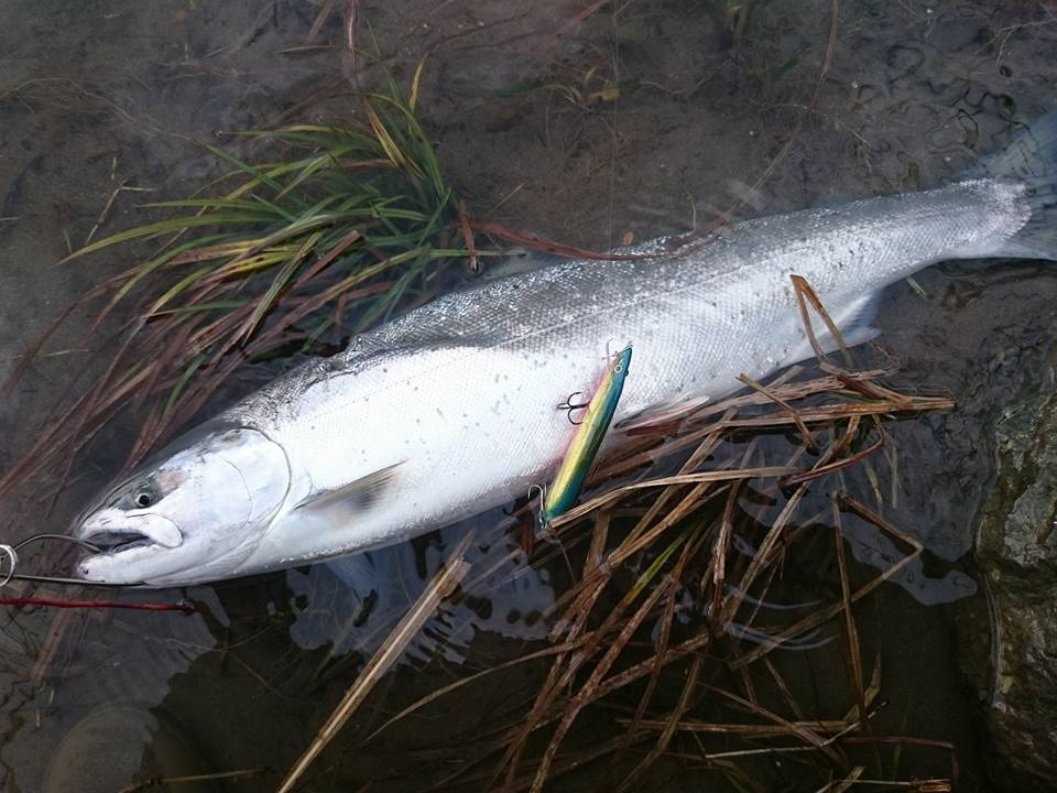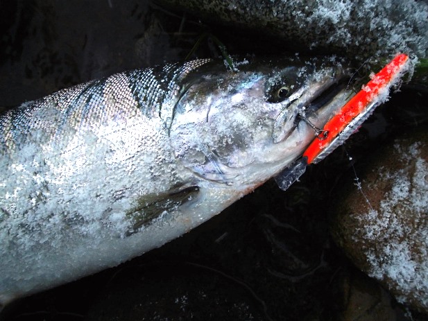 サクラマスのルアーフィッシングを長くやって来ましたが、最近サクラマスの餌釣りが増えてきたように感じる。 2000年代初めぐらいから多摩川山女魚道の細山長司氏などにより啓発され始める人が多くなった。 私も細山氏の米代川ビデオ(DVDではない)を見て小国川などでチャレンジして2度ほどヒットはしたものの専用の竿は結構高価であったこともあり、使用した鮎のコロガシ竿だったり本流竿ではバラシのみであったため、ルアーの方がお手軽と執着することなく忘れていた。 そんな延竿でリール無しだからルアーより釣るのが難しいと餌釣り師が言うサクラマス餌釣りについて、始めたばかりで僭越ながら書かせて頂きますが、少なくともサクラマスのポイントや掛かってからのファイトなどは長年の経験から熟知しているのでヒットはもちろんランディング出来る自信はありました。 サクラマスは餌を喰うのか? 喰う食わない、学説では川に遡上したサクラマスは餌を食わない とされる意見が多いのですが、口に入れるけど胃に入らないとか、 胃には入っている事はあるが消化しない、腐るだけとか 食事としてのサクラマスの食性は賛否両論あります。 しかし、私はたぶん学者より多くの自然のサクラマスを見て来ているし、 大型サクラマスから小型のグリルスまで銀毛(スモルト)や 疑似銀毛(シュードスモルト)果ては養殖や湖沼型のサクラマスも見て来た結果、 喰うのもいれば死んでも食わないのもいると言う事が分かっています。 要するに簡単に言えば餌を喰うサクラマスは確実にいると言う事! だからサクラマスは餌で釣れると言う事です。 実例を挙げると (1)私がスプーンで釣った、小魚を食っていた赤川サクラマス56cm。