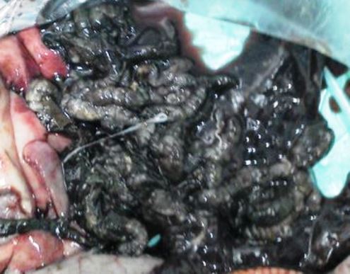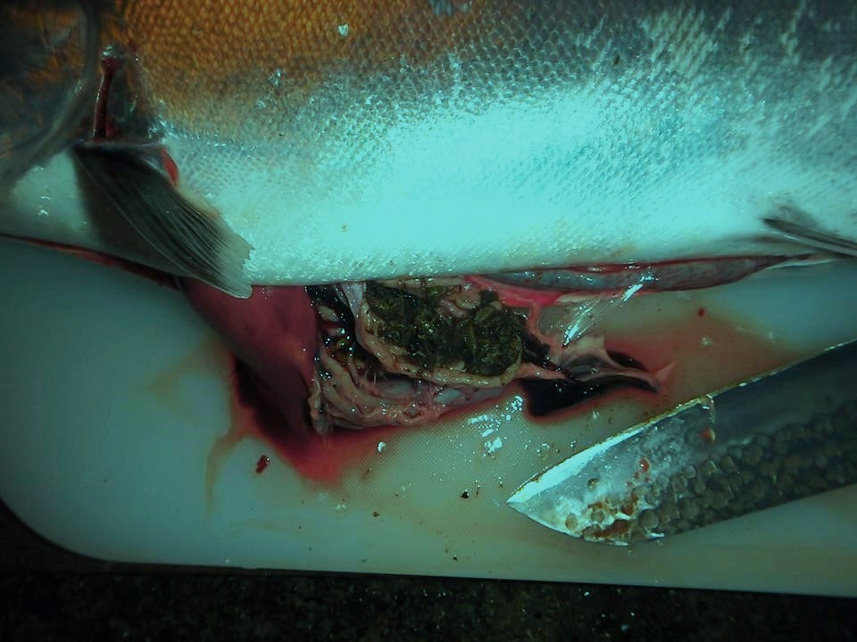 「木村氏撮影&コメント:川虫少し食ってるサクラマスはいたけどスズキ見たいに魚丸飲みは珍しい、しかも消化してるし。」 (2)堀口氏がミノーで釣った黒川虫を食っていた九頭竜川サクラマス。