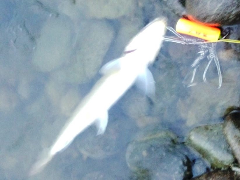その後数回流すとグングングンと重い段のある引きで何物かが掛かる。 残念ながら上流に走ってジャンプ一発で外れたが50cmぐらいのサクラマスだった。 うーん、ルアーでまったく来なくてもこんなに当たりがあるのではチョット本気モードに。 元々渓流餌釣りやテンカラやフライやってたし、 10mの長竿普通に使って大鮎釣りしてるんだから サクラマスの餌釣りって今までやらないのが不思議なくらいだよな。 実釣3 堰堤下で凄いアタリとローリング! また大岩魚かはたまた大型サクラかと思いきや ゴイニ―でした(^O^)
