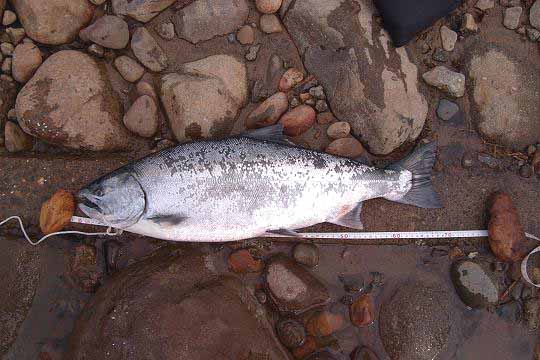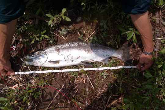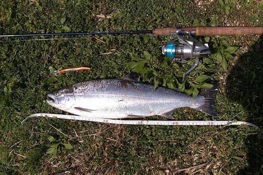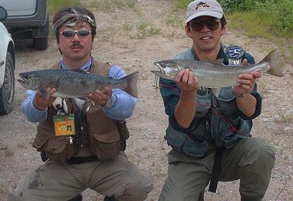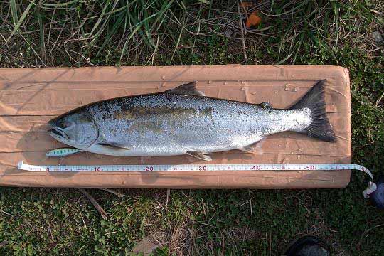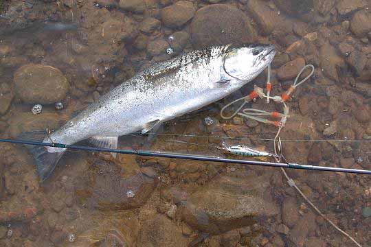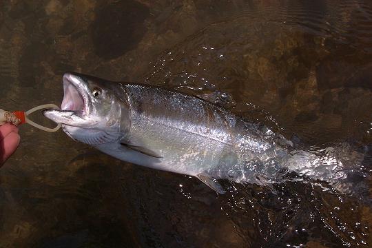 赤川は今日の水量ではまだまだなので、某中小河川に行ってきました。午前中水温が7℃でアタリが渋く、虹鱒28cm20cmにヤマメ26cm〜20cmが3匹、岩魚42cm、36cm、25cmでしたが、午後から先々週サクラマスをバラしているポイントに行くと今日も2匹いるではないですか、1投目チェイスがあり、同行の仲間を呼び、2投目で簡単にヒット!大合わせの後、強引にランディングに入るが以外に引きは強くてドラグを3度引き出した。あまりバシャバシャしたので2匹目は逃げたかなーなんて山っ気を出しながらランディング成功!今期2匹目は52?1.8?♀のフレッシュランでした。ここは同行の仲間が午前中かなり攻めた所だと言うのですが、ヒットした時の水温は13℃になっていたのでシェイキングに一発で反応したようですね。