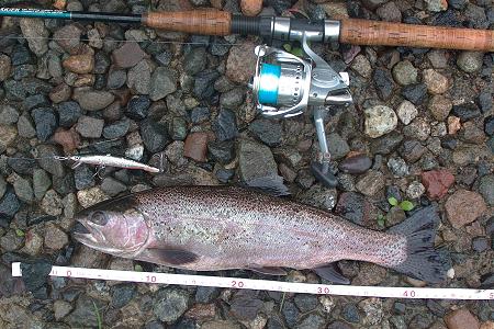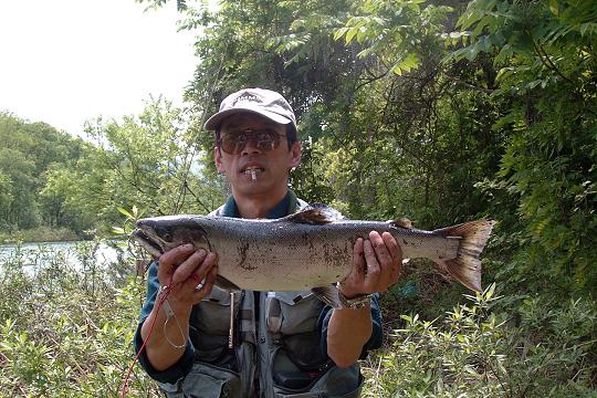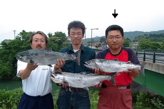 佐竹君が2バラシうち1匹は65cm級バラシ、これは痛がって3回ジャンプしたので私が確認済み(涙)土屋君も堰堤上でバラシでした。 6月2日 日曜日から水温が下がって、サクラマスの活性が落ちたようでした。やはり日曜から昨日までは、私の知る限り、日曜日は2匹上がりましたが、月曜日は群馬の横田氏の49cmしか上がってないようです。今日の私は50cm級サクラマスのチェイスはありましたがヒットせず、その場で2cm足りないサクラマスを釣りました。38cmの小サクラです(笑)山女魚に換算すれば尺3寸近い大山女魚なんでしょうが、ガッカリしてリリースでした。(注!これでも普通は立派にサクラマスとして漁協に登録できますよ。) 後は岩魚の43cmでした。 6月3日 今日は36cmの岩魚とニゴイのスレだけでした、サクラマスの活性が下がるほど水温が急に下がると岩魚しかヒットしませんね。 6月9日 pointさえ選べばヒットはありました。