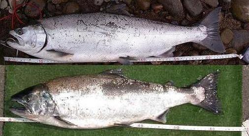 ![]() 今野会長66cm3.4kg♀ゲット!!おめでとうございました。彼はいつも12ポンドなのに今日に限って10ポンドに渓流用のランディングネットで良く獲ったモンです。そのネット持って行くと大物意釣れるジンクスみたいね、いい魚でした、そのほか今野会長も1匹バラシ 上が今野会長の66cm3.4kg♀、下が私の63cm2.9kg♂です。並べると雄と雌の違いが良く分かります。さすが会長!恐れいりました。貴方が現在大物賞トップです。これ以上はう〜ん。