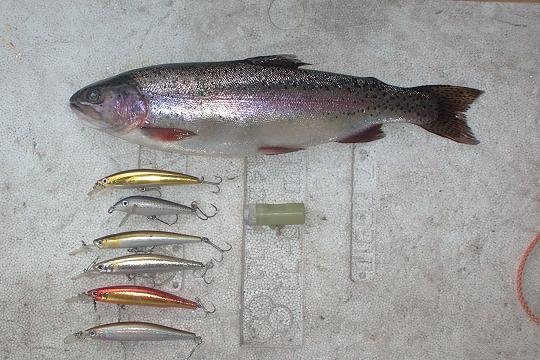 深い淵の底まで改造ディープダイバーを沈めディープレンジでシェイキング&ジャークを繰り返して3ヒット1ゲット、47cmのレインボーで良い引きでした。同行の今野会長が50cmのイワナゲット!メンバーではHonma君の50?と同じ今年2匹目の50cmでした。赤川は減水してサクラがあまり出なくなると大岩魚が出ます。