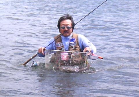釣れたのは信頼できる『クラブシーマ』メンバー平山氏が、昨日ヒット後の走りをこらえて、ローリングまで行ってからバラしたと言うのでポイントを聞き、俺が捕っちゃるとみんなに予告して行きましたが、予定通りでした。 やはりシェイキング&ジャークは少し効果あるようです。 今日は雨降りでポイントに午前7時半に着くと、ライズを発見!私が得意の「ライズリングへのシェイキング」に絶好の展開、しかも同じフィーディングレーンで規則的にモコッと出ている。あせりながらも急いで準備開始!オスプレイ/sky-passをセッティング(急いでいたので気付かず、のちに分かったのだがオスプレイ/リトルジョンだったのである。) 自分的にはもう捕ったも同然の状況である。上流に回り込んで右岸から30m以上下流のライズの左後方を狙ってキャスト、上手く落ちた。ライズの核心に向かって少しずつ近付け、シェイクを2回した位でグンっとアタリ、すかさずアワセを入れると1.5kg設定のドラグがジッジジーっと出る、これは大きい。小物ではまったくでない事が多いからだ。まさか鯉?いやそんなはずはと思っていると更にジーと走る。合計20mぐらい出たかな、落ち着いたのを確認してこちらに顔を向かせガンガンポンピングしたが、中々引きが強い。やっと水面に出たら大きい、65cmは確実にある、これは平山君の言った奴に違いない、ここでドラグを4分の1回転緩める。魚は私と平行に流れに逆らって泳いでいる。丁度ロッドを後ろに倒したら足元にサクラが来るぐらいにラインを手尻1mぐらいまで巻き取りネットをはずしてランディング!!AM8:00ジャストぐらい。 すかさずメジャーリング、70cm、ヤッターついに幻をゲット!常に私が中流のサクラマスで使っている4kg秤に掛けるがストンと簡単に最後まで行ってしまって4kgなんて目じゃ無い、5kgはありそうだ。のちに計ったら5.1kgこちらでも自己記録だった。 ふと見ると私は右岸から釣って魚の左側へ綺麗にクラッチフッキングしてましたが、右側にかなりむごい傷がありました。やはり昨日の魚だったんでしょうね。 でも真面目な話今までもこのサイズは何度か掛けていましたが、私の釣り方がダウンクロスの「シェイキング&ジャーク」なのでまともに水圧が掛かるため引きが倍加してよくバラしてました。それでラインを最近はサクラマスミノープラッギングでは普通はありえない16ポンドまで上げラインブレイクを防ぎ、以前はドラグを最初緩めに設定して置き後で閉めるやり方だったので大型がヒットした時、何度も走られて怖くなって閉めこんでのラインブレイクだった。最近は最初からかなり閉めておくやり方で、魚が近くに来てから後で緩めると言うふうに変え、海の帝王で、サクラマス釣りでは私の弟子の『クラブシーマ』メンバーHonma君を見習って、ドラグテンションを1.5kgにして障害物への走りを止め、フックを伸び難い太軸の物に変え、摩滅するクロスロックスイベルをやめ、クロスロックスナップにして万全を期してました。そこに図らずもルアーメーカーのオプセル社から誘導フックシステムのボーグ・オスプレイにサクラマス専用モデルの開発協力要請があり、これなら今まで捕れなかった幻の憧れの70cmがダウンクロスの私の釣り方でもボーグ独自のクラッチフッキングで捕れると確信したのが現実となり、達成感で涙が出そうでした。80cmを捕るまでは泣きませんが・・・。 ヒットルアー・・・オプセル オスプレイ/リトルジョン9cm金黒オレンジベリー 5月24日
