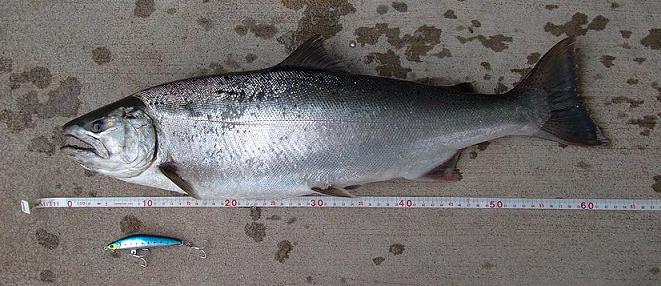 63cm3.2kg♀の鱗が取れないタイプ、シェイキング&ジャークに反応する居付きのテリトリーを持つサクラマスでした。荒瀬の逆引きでかなりのファイトだった為、16lb.ですらラインはボロボロでランディング後、撮影の為にチョット引っ張っただけでプツッとあっけなく切れてヒヤッとしたが、やはりボーグのクラッチフッキング、根ズレに強いライン、ドラグ調整の全てが揃っての「ボーグ・サクラマス初クラッチ達成!!」でした。ヒットルアー・・・オプセル オスプレイ/sky-pass9cmイワシ 5月17日