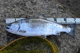 その瞬間から同行のjakoさんや回りの皆に重量感から「60cm3kgだな間違いない」と推定して宣言した通り計測したら61cm3.1kg♀のサクラマスをランディングしました。 最初いらないスプーンで川底を転がしてリサーチしたところ川底が昨年とは変化し、中央やや左岸よりに馬の背と下手に掛け上がりが出来ていました。その馬の背の上流左岸寄りに当たる部分で何度もライズがあり、溯上ラインである事を確信(そんな思い込みで良いんです。)、何度もキャストして、午前10時過ぎにようやくヒット!やはりいかにイメージするかが、肝ですね。ただし、釣り方は4月25日発売のソルト&フレッシュに書いた初期のスプーン丸秘お手軽釣法なので、今は恥ずかしくて言えませんから(笑)読んで確認下さい。 今回のヒットもjakoさんと雑談中でした。しかもタックルは70?を想定してますので余裕ですからまるでふざけたランディングで遊んでました。やはり下流は運だけですよね、ラッキーでした。でもアソコまで16ポンドで飛ばすには腕力が不可欠です、だってもうすぐ対岸の掛け上がりですから(笑) 私のように小物との遊びを捨てても対大物を想定した強引なポンピングが出来るタックルの方が力任せにやり取りする人は良いと思います。ラインの太さとヒットは何の因果関係も無いと私は思います。 ラインはバリバスソルトウォーターVEP16ポンドでスプーンはフィールドハンターADAY18g赤金です。 3月22日 今日は曇りなのに寒い、先週のようなサクラマスのライズもジャンプも無く活性が落ちている事は間違いない。ミノーでは無理だなと思いスプーンを転がすが、釣れたのは木の根と空き缶のみでした。空き缶は中々良い引きを見せましたが、ドラグは出ないし首振りはしませんでした。午後2時まで頑張りましたが寒くて参りました。仲間の情報では3.5段左岸と袖裏橋右岸で50cm台が2匹上がったとの事でした。大型が出ない時は活性が落ちた時です。 3月29日 最上川を見てチョット投げてから赤川3段、3.5段に行きました。 10時頃に良型サクラマスのライズが散発的にあり、期待しましたが私だけではなく誰のロッドも曲がりませんでした。こう言う魚は夕マズメに来るのかも知れませんが、私ら日帰り組は次の日の仕事もあるので夕方には既に帰宅して一杯やって明日への英気を養わないと・・・。でも100%夕方に釣れるなら頑張るかも(笑) 4月5日