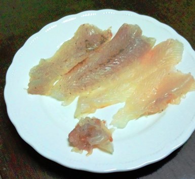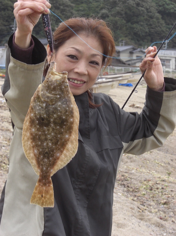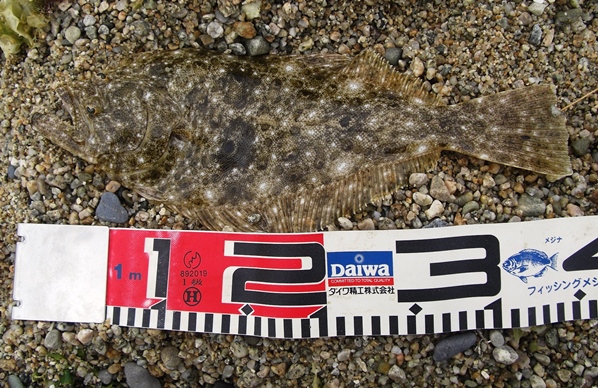 山形県の捕獲体長制限はヒラメ(全長30cm) なので 余裕でクリア(^^ 私が釣ったらソゲですが、妻が釣ったのでヒラメです(笑) 刺身で美味しく頂きました。