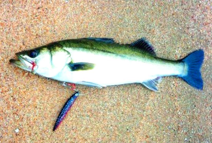 駆け寄ると 海水浴場の静かな水面にキャストして遊んでいたら釣れたって。 セオリー通りだ。