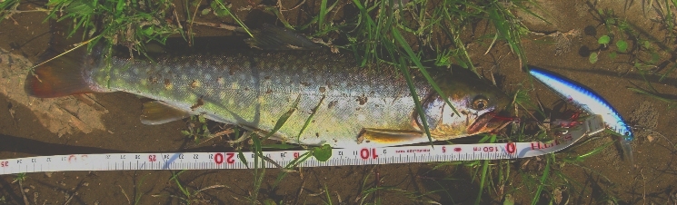 こう言うリフルポイントでは大型のオスは、ほとんど釣った事が無い。 鮎とサクラマス共通で抱卵したメスが多いポイント。 50cm以下のグリルスタイプはオスメスどちらも多いポイント。 推定水深1m20cm MDに最適な水深でサクラマスの気配濃厚! さっそく前回使い倒したショックリーダーを組み直す、昨年は22.6ポンドPEを犠牲にしないよう30ポンドリーダーから22ポンドリーダーに変えた。 今日は老眼鏡を忘れたから苦労した(笑) バネ計りでドラグ設定2kg確認、オスプレイMDブルーを結んで 馬の背の際を撫でるように攻めると3回目で水面が炸裂してヒット!!! なかなかその場から動かなかったが、フルテンションを掛けると 2回ほどローリングしたあと下流に一直線に下り2kg設定のドラグが ズィーーからチィーーーっと逆回転速度が上がる こりゃー久々の4〜5kgクラスだなっと気合が入った。 何度も横のポンピングをして水面に出ないように目の前5mまで寄せて 姿を拝む、ジャンプやメチャクチャな暴れ方をしないからメスだろうな と思った通りジャンボな御嬢さんだが重い重い、 丸々太った5kg70cm前後のサクラマス♀のようだ クラッチフッキングはバッチリ決まっている。 ドラグをいつものように最後の走りに備えて緩める。