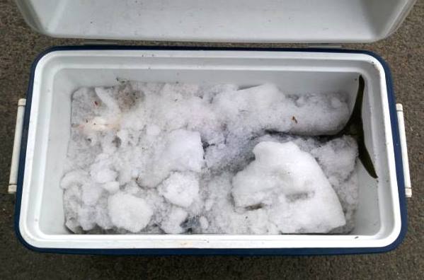 気温が高く3,000円分の板氷10枚でも、 3日の間にはみるみる溶けるので 月山スキー場まで雪を取りに行って来ました(^_-) いつも6月半ばまで志津から少し登れば楽に雪が取れるのに 今年はスキー場まで行かないともうありませんでした。 これで上から順にトビウオ・ブリ・ワラサ・サクラマス・アイナメの鮮度は一安心です。