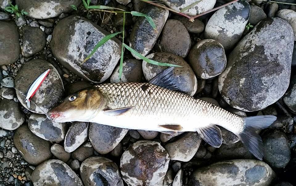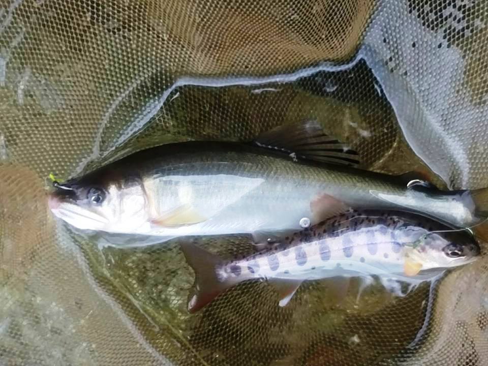 明日から鮎解禁! 午後から最後のサクラマス釣り、荒瀬尻を何度も何度も流し込んでようやくヒット!!! この流れでは小物は定位できない。凄いトルクフルな引き”!また超大型サクラマスか超大岩魚か?でも案外早く引き寄せ? 超1級ポイントの瀬尻にこいつがいるのでは(-"-;) 2尺岩魚が釣れる時はサクラマスがいない時、ニゴイが釣れる時は鮭科魚類が全ていない時、超荒瀬尻で素晴らしいファイトでした(^_-)