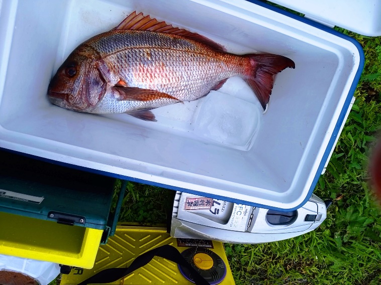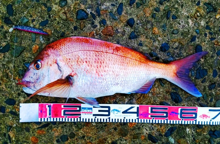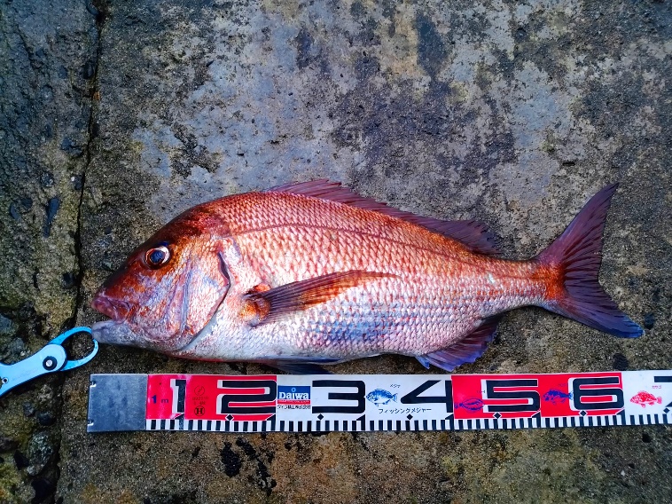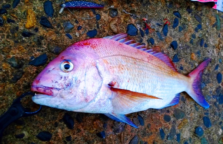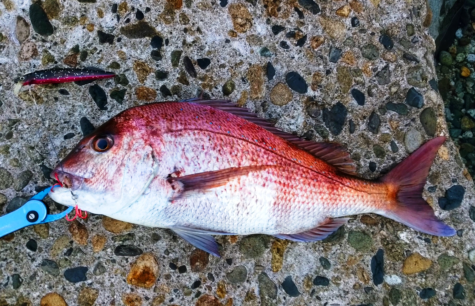 今年は釣りの間、食事はグラノーラだけにし、 HMBとBCAAを水で流し込むダイエットをしている ので春に86.5?だった体重が、78?までしまりました。 鮎釣りは水に入ってウェットスーツを着ているからあまり暑さを感じませんが、 陸からのタコ釣りは汗だくだく、距離も歩くので減量に最適かも(^^♪ それにしても暑くてノースリーブを着ていたのでこの夏最高の日焼けで痛い。 8月25日 今日も海へショア真鯛ルアー確立を確かめに(^_-)-☆ 4時過ぎに着いたら真鯛・黒鯛ポイントに先客がいて入れず、 やむなく新規開拓すべく移動、潮通しの良いカレントがあってハエ根があって深場に繋がるポイント。 ありました! 5時からキャストして100投以上した頃、ガガーン! ドラグが出て行く〜思い切り合わせてポンピング。 大型真鯛に間違いない。 5分ぐらいで水面に出てきたのは紛れもない大型真鯛2尺は充分にある。 今日もせオリー通りでショア真鯛ルアー確立と思った時 スマホで水面画像撮ろうとしたらいきなり潜って動かなくなり 糸を緩めて動き出しを待ったがアウト。 岩の隙間に潜ってルアーを外した模様・・・。 鮎釣りの同行者を待たしているので鮎に変更"(-""-)"