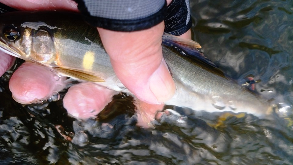 しつこくしつこく瀬脇や浅いリフルを攻めるとゴゴン! グルングルンと小さなローリングだが、川幅が狭いので 危ない危ない!(^^)! 小さいがヒレが黒いから海には行ったようなので一応サクラマスだな。