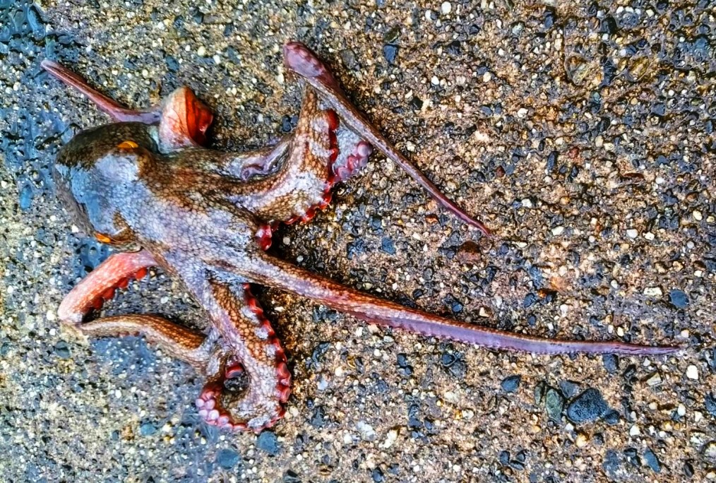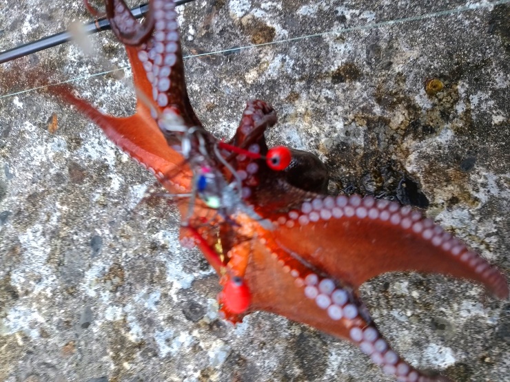 今日も大荒れの予報、なので常時撤退準備しながら 車から離れない距離にあるポイントでのタコ釣り。 チビタコ2匹オートリリース後に 流れ藻のように浅場を移動中のタコ発見!! 一度合わせを失敗したが、直後早々に良型のタコヒット! 重いけど中タコかなと思った。 その後、暴風になり海も高波で大雨になり荒れてきたため撤退。