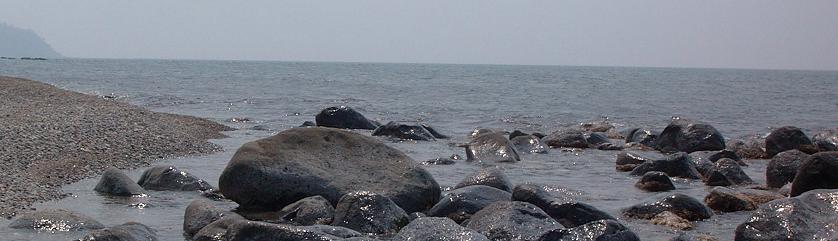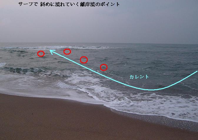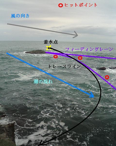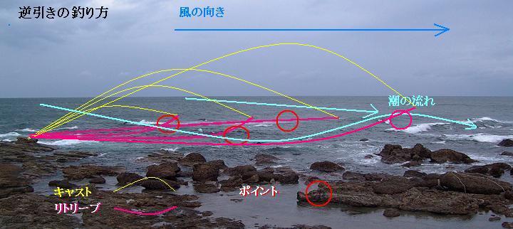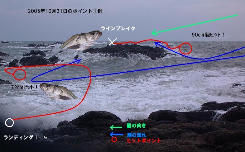 少し波が有る時に簡単に表層の流れを見るには フローティングミノーを投げてほっとけば流れが見えます。 ゴロタやサーフのような遠浅の所ではカケアガリに沿って横に投げて 引いて来ると感じが軽い時と重い時があります。 軽い時は流れの上流に投げてる訳で重い時は流れに逆らって逆引きになっている時です。逆引きの方がルアーの動きが良く釣れ易いです。 また、巻いて来てある一定の所だけグンっと重くなるところに行き当たったらそこが離岸流でそこを集中的に沖に向かってスポット的に攻めれば良い結果が出るでしょう。 水面から出ている岩や大石等の障害物より風上 にキャストしてラインスラックを出しすぎると岩の溝やヒザラ貝にラインが食われて(挟まって)しまうので気をつけないとラインに傷がついて切れたり、ルアーをロストしてしまう。 海からの風(山形では西風)が強い時は波が高いのでテトラの内側とかワンドのような凪のエリアを狙います。