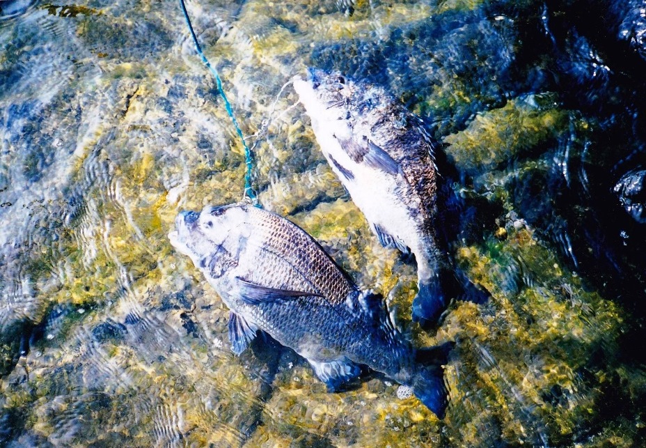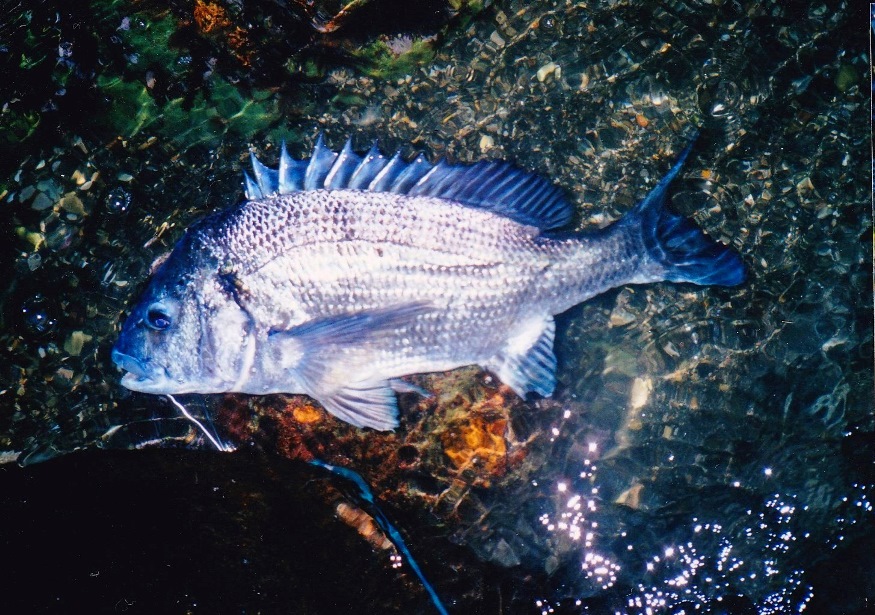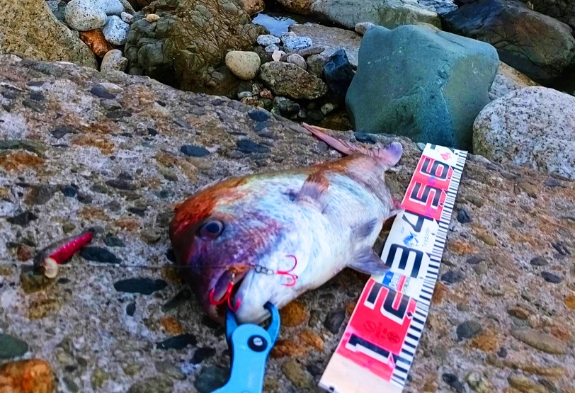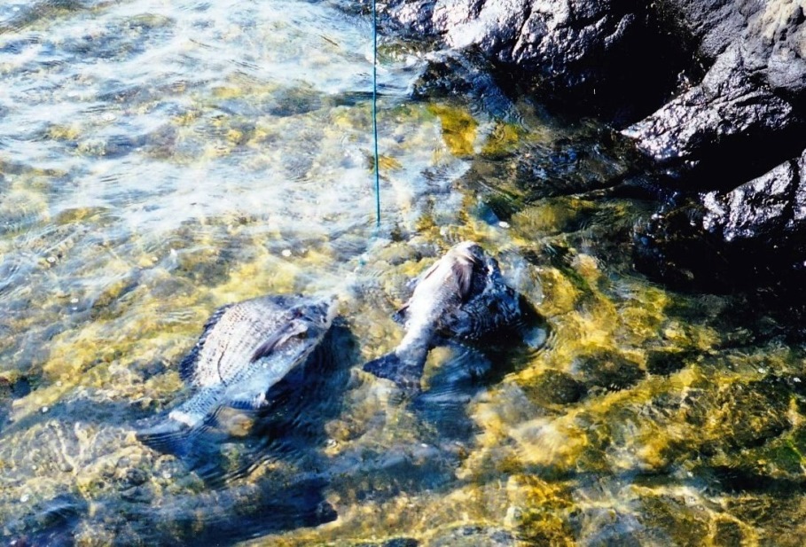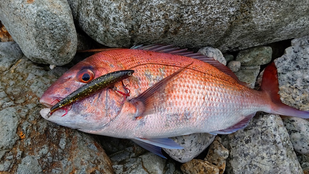 私のサクラマス釣りの『シェイキング&ジャーク』がたまたまクロダイに合っていたのです。波打ち際 に立ち、沈み根や岩の脇を狙い小刻みなシェイキングをしながらのジャ−ク、リトリーブスピードは普通シーバスを釣っている時より少し早めが良いでしょう。そのためシーバスは追い切れないのかスレでヒットする事があります。クロダイやイナダは余裕 でガッチリ食って来ます。