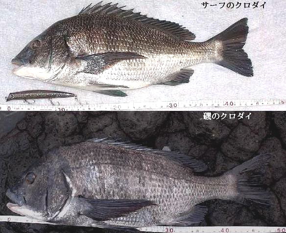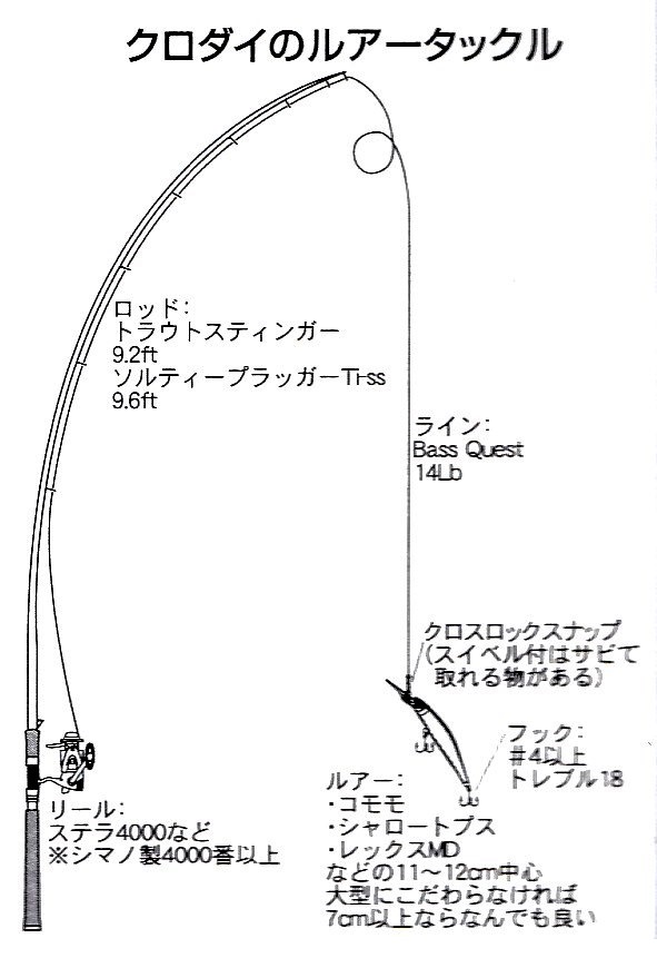「水温」 まだデータ的に不十分なので、これは参考程度ですが、私が釣った限りではショアの表面海水温18℃を下回るとクロダイはトップからシャローのルアーには反応がかなり悪くなり、ボトムへのアプローチが必要になるようです。まだ試行錯誤の段階ですが、ミノーをチェイスしてきてバイトしない個体へワームを投げての一瞬のバイトはありますので、ボトムはこれからの課題です。15℃以下になるとクロダイを狙っていてもシーバスが活発にヒットします。しかし、2003晩秋15℃以下の時に釣友がシーバス狙いで2度タイドミノー138mmの大型プラグで46cmと48?の良型を釣っていますから先入観無く狙って見たいと思います。 「タックル」