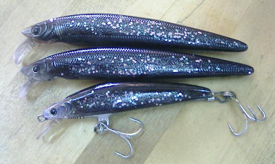 『レッドベリー有効論』 海の魚(特にヒラメ)にレッドベリーが有効と言う事は確かです。カラーチェンジをして行くと白い腹で通した後でも赤い腹(レッドベリーやオレンジベリー)でトレースするとヒラメが来る時がありました。だからヒラメポイントである砂礫底やサーフの小川の流れ込みなどは必ずチェックです。そんな時のために銀黒レッドベリーをSS(スーパーシャロー)でお願いして作ってもらいました。