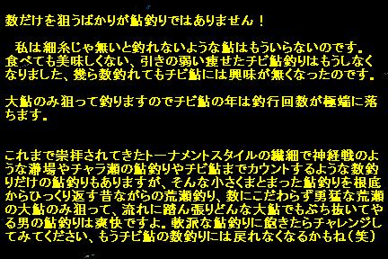私は細糸じゃ無いと釣れないような鮎はもういらないのです。鮎友釣り本来の醍醐味を凝縮したパワフルでスリリングな昔ながらの荒瀬釣り、流れに踏ん張りどんな大鮎でもぶち抜いてやる男の鮎釣りは爽快です。流されるのは覚悟の上で最上川の激流に立った時、 貴方は『Fight or Flight』(闘争か逃走か)?中小河川や小物の数釣りを卒業したら、いよいよ大河川の豪快な大鮎釣りです!でも泳げない人は無理しちゃダメよー。
