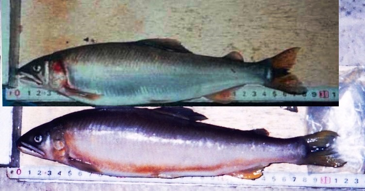 私の最上川記録28.5cm330gと冷凍で送って頂いた長渡氏の普通サイズ五ヶ瀬川32cm400g