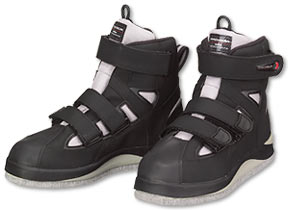 右画像ダイワから出た「プロバイザー ベリピタロックシューズRH-2500BP(ハイカット)」と言うものはマジックテープのベルクロなので脱ぎ履きが楽々でしかもガッチリ固定できる上にベリピタでフェルトスパイクソール(BPS-130R 3L)の取替えもワンタッチで海&サクラマス用と鮎&渓流用に使い分けています。踏ん張りが必要な磯や超ハードな泳ぎ釣りをする鮎に使ってもなんら問題無いほどで、多少重いのを気にしなければもう他のシューズは履けないほど最高に気に入ってます。