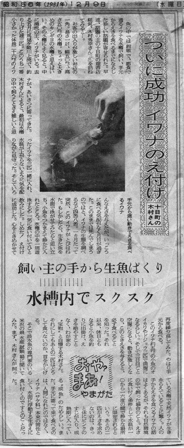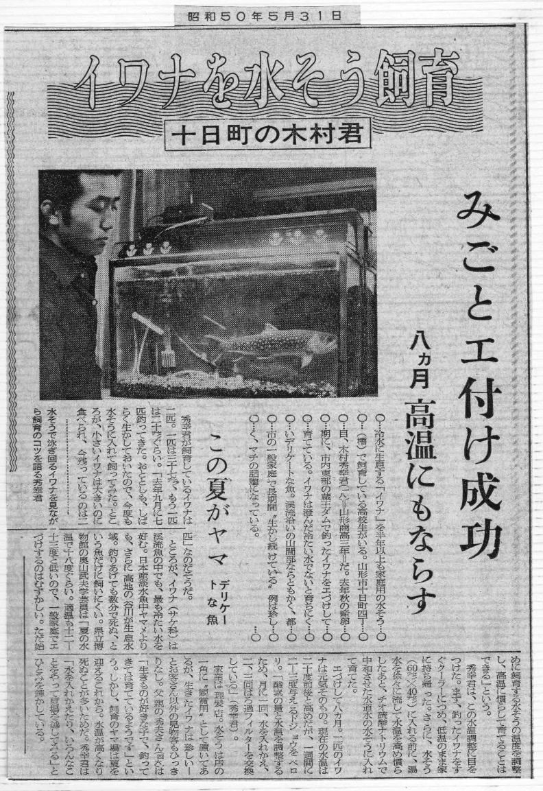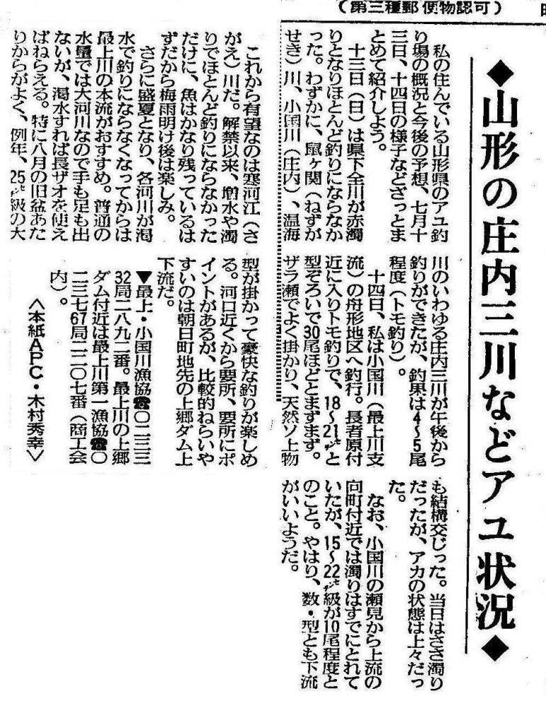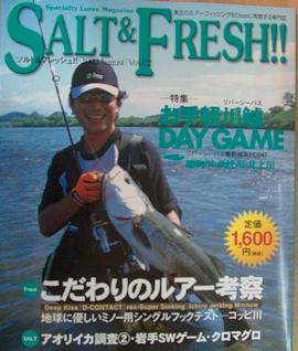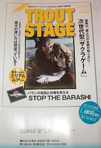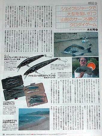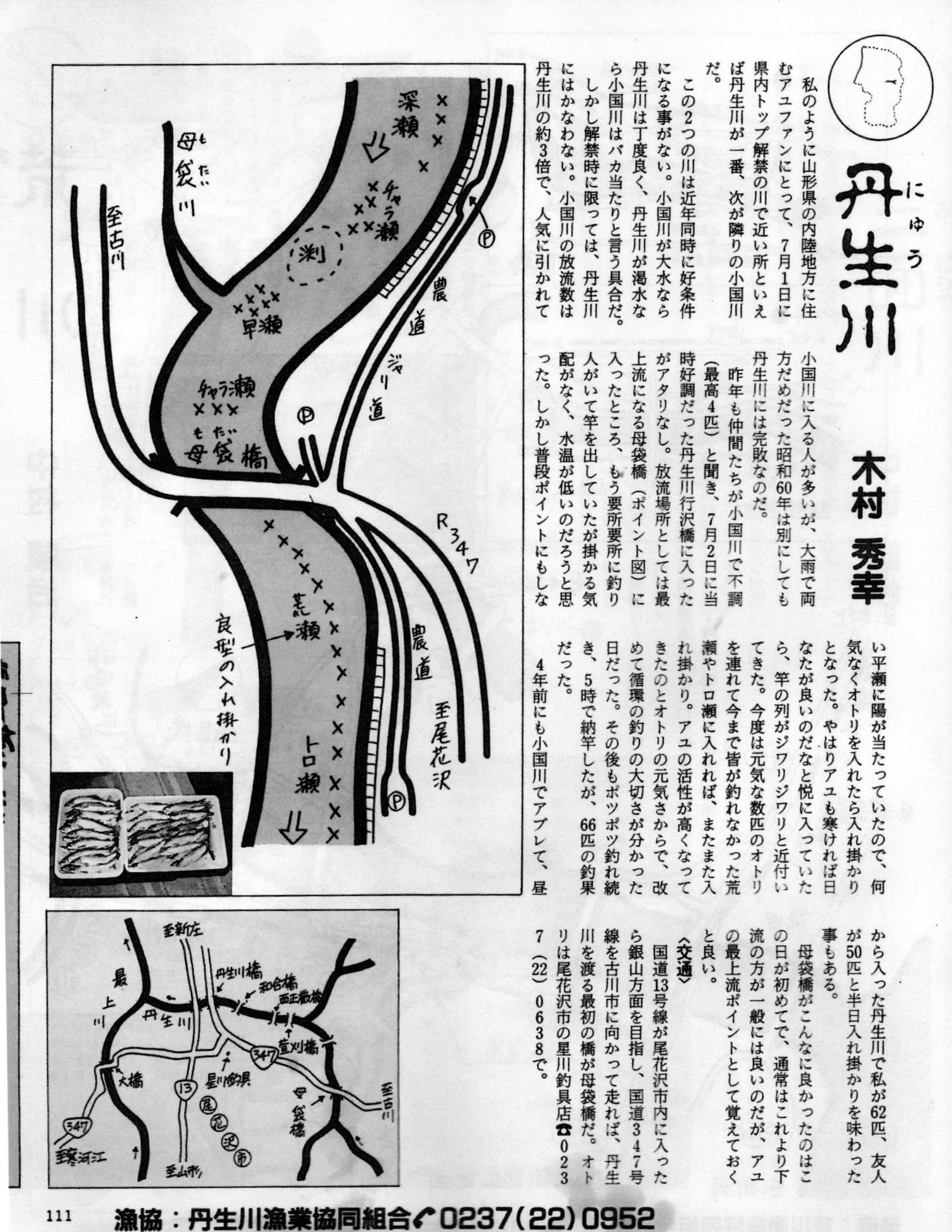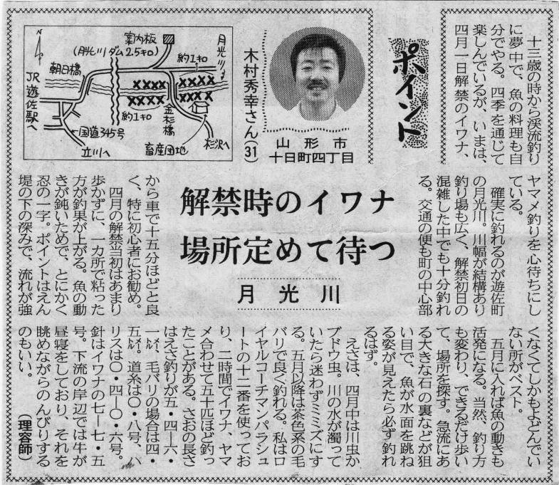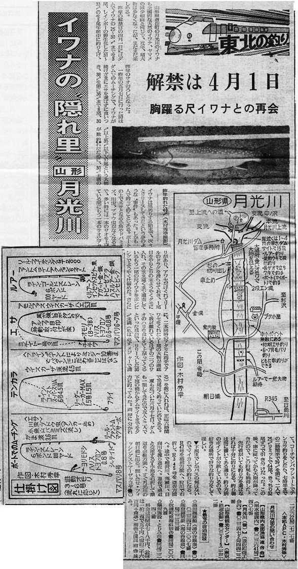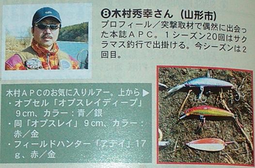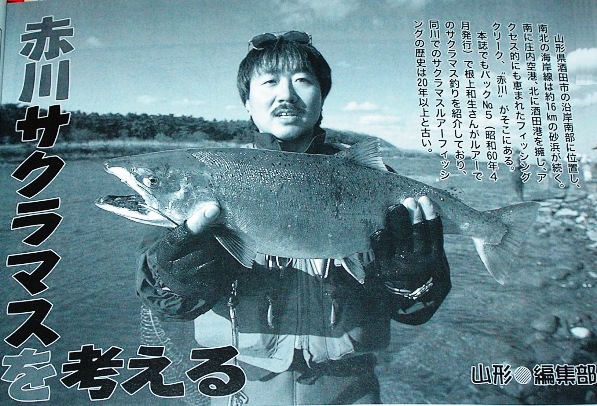 『ボーグ』フィールドテスター 『クラブシーマ』所属 1958 2月生まれ 血液型B 1968 馬見ヶ崎川にてアブラハヤを釣る。霞城堀にてフナ釣りをする。 1970 中学1年の初夏、岩波の龍山川で初めて15cmのイワナを釣る。 1972 秋の龍山川にて30cmのイワナを初めて釣る。イワナの水槽飼育始める。馬見ヶ崎川でオイカワを釣る。 1974 秋の蔵王ダム上流葉の木沢にて33cmの雄の尺イワナを釣る。 1975 高校3年、インターハイ全国個人団体ともベスト8(東京日大講堂で開催)国体(三重県)個人ベスト8。蔵王松尾川にて初めてヤマメを釣る。山形新聞にイワナの水槽飼育成功の記事掲載。馬見ヶ崎川で初めてアユの友釣りのまね 1976〜東京へ〜1980この間、ブランク。東京で理容美容の修業、各種理美容コンクールで上位入賞。この間釣りはブランク。 1980 帰郷後、馬見ヶ崎川では初めてこれまでいなかった放流ヤマメを確認、尺ヤマメも釣る。 1981 菖蒲川で39cmのイワナ。山形新聞にイワナの餌付け記事掲載。 1982 年間1000匹以上渓流魚を釣る。YTS山形テレビnewsにイワナの水槽飼育と餌付け調教で出演。 4月14日初めてテンカラで釣る。尺2寸のイワナ もテンカラで。 1983 テンカラで一日79匹釣る。年間3000匹以上渓流魚を釣る。依頼が有り半職漁師のようにイワナ・ヤマメを高級料亭に1キロ2,800円で卸し売りする。テンカラでも引き抜き100パーセント出来るようになる。フライを始める(ドライ・ウエット) 1984 超簡単テンカラ確立する。37cmのイワナ、38cmのイワナ。銀山川ダム・月光川ダムでムーチング(クチボソエサ)で大漁。週刊「釣りニュース」APCとして原稿依頼。 7月23日に五十川でアユ釣りの面白さを教えてもらう。8月6日ア ユ72匹釣る。引き抜きマスターする。イワナ・ヤマメの養殖盛んになり1キロ1,000円まで値下がり数釣りから大物狙いに変更。志津五色沼でムーチングにてブラウントラウト36cm。 1985 ルアー(スピナー)で初めてイワナ・ヤマメを釣る。サクラマスのルアーを始めるがなかなか思うように釣れない。 1986 間沢大沼でヒメマスを釣る。高級料亭より依頼で鮎1キロ5,000円で卸すようになる。 1987 寒河江川でアユ101匹釣る。アユ26cm釣る。季刊(春夏秋冬)から隔月刊になった「釣り東北」よりアユ原稿依頼『舟形町の小国川下流』掲載。 1988 結婚。隔月刊「釣り東北」よりアユ原稿依頼『最上川水系・寒河江川のアユ』掲載。この年は最も早く10月28日に蔵王スキー場滑降可能で、11月第1週からリフト稼働。 1989 山形新聞に「月光川ポイント」掲載。馬見ヶ崎川頭首工でレインボー46cmハスルアー3・5gGで。 1990 馬方川でイワナ42cm。 1991 月刊「釣り東北」別冊アユパート2に山形県のアユ河川、最上川・赤川・五十川・寒河江川・丹生川を紹介。この年、まさに解禁当初は小国川より好調と紹介した丹生川の解禁でアユ105匹釣る。 1992 月刊「釣り東北」別冊アユパート3に『自宅でのアユ飼育法』掲載。清川でアユ29cm(300g)・28・5cm(340g)含む良型ばかり。 1993 「釣り東北」別冊ザ・アユ極めつけに『激流で釣る大アユ必勝法・最上川本流』掲載。五十川アユ94匹。最上川で半日で落ち鮎コロガシ340匹釣る。 1994 赤川サクラマス大当たり。6回ヒット、(45〜55cm)4匹ランディング。五十川アユ91匹。最上川で一日で落ち鮎コロガシ747匹釣る(もう止めようと思った。) 1996 馬見ヶ崎川でレインボー52cmヒット。『釣りトップ』取材中袖浦橋でサクラマス57cm2・5kgヒット、『グラビア』掲載。山形新聞に「ため息が出る河川工事」掲載。 1997 鮭川でウケクチウグイ62cmヒット。キャッスル今野氏と米代川の帰りに赤川で57cmのイワナがヒット。「釣り東北」別冊ザ・アユ極めつけに『天然遡上の大鮎狙い・最上川』掲載。 1998 「釣り東北」同行取材で60cm2・8kg雄ヒット。5月号『表紙』 ・『カラーグラフ』・『実釣記』が載る。サクラマス10回ヒット55〜63cm3kg5匹ランディング。 1999 アメマス47cm、サクラマス9回ヒット43〜62cm3・4kg5匹ランディング。「釣り東北」2月号『1998赤川サクラマス釣行記』掲載。 2000 2月「釣り東北」別冊『北の本流』に1999赤川サクラマス釣行記。 6月12日68cm4・3kg♀、サクラマスを釣る。「釣り東北」6月号「大アユタックル紹介」掲載。8月号『赤川はスプーン復活』掲載。サクラマス12回ヒット。11月シーバスに挑戦54〜66cmゲット。 2001 1月「釣り東北」2月号に『サクラマスは“UP&DOWN”』掲載。5月「釣り東北」6月号に『サクラマス必釣の法則』掲載。70cmアップのジャックに12ポンドラインを切られる。スズキのルアー釣りで47cmのクロ ダイが釣れた。その後41・45・46・48cm次が43cmまた次の週、46・47cmと50cmオーバー2匹ランディングしクロダイのルアー釣りを確立。80cmオーバースズキ。11月3日にHP「サクラマスのルアーフィッシング」を立ち上げるも何せ9月からPCを始めた初心者の為進まず・・・。 2002 1月「釣り東北」2月号に『狙って釣れるクロダイのルアーフィッシング』掲載。この頃ようやくHPに色々アップし始める。5月「釣り東北」6月号に『21世紀的サクラマ
