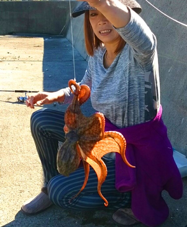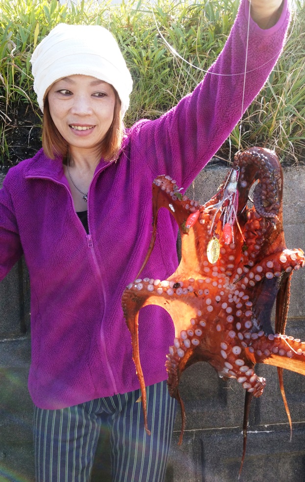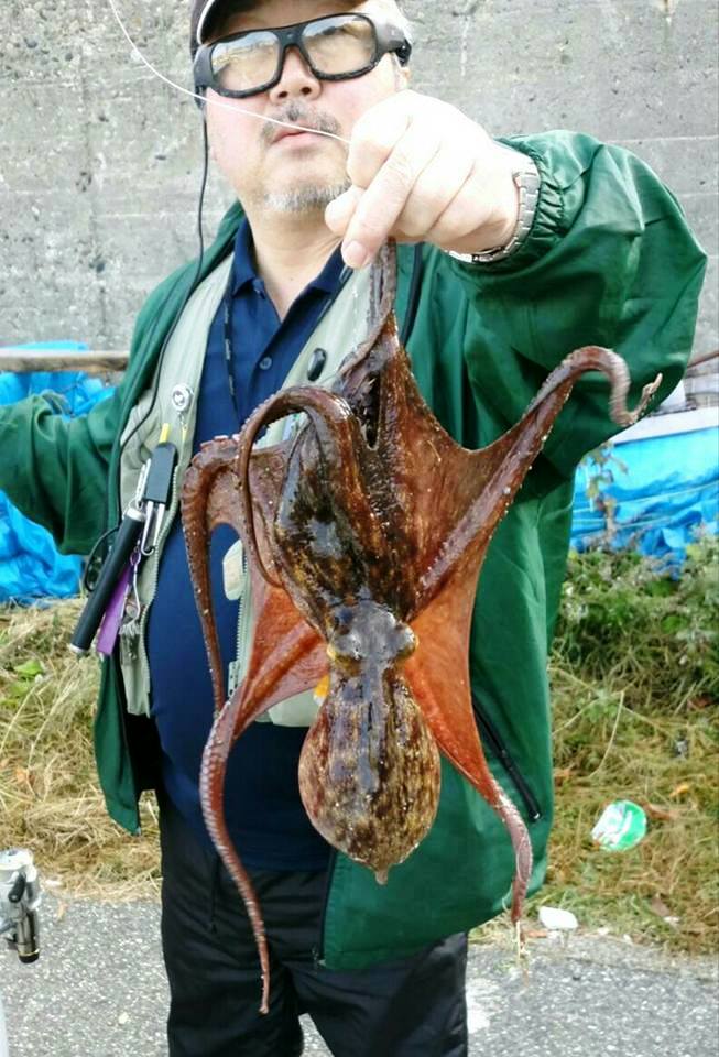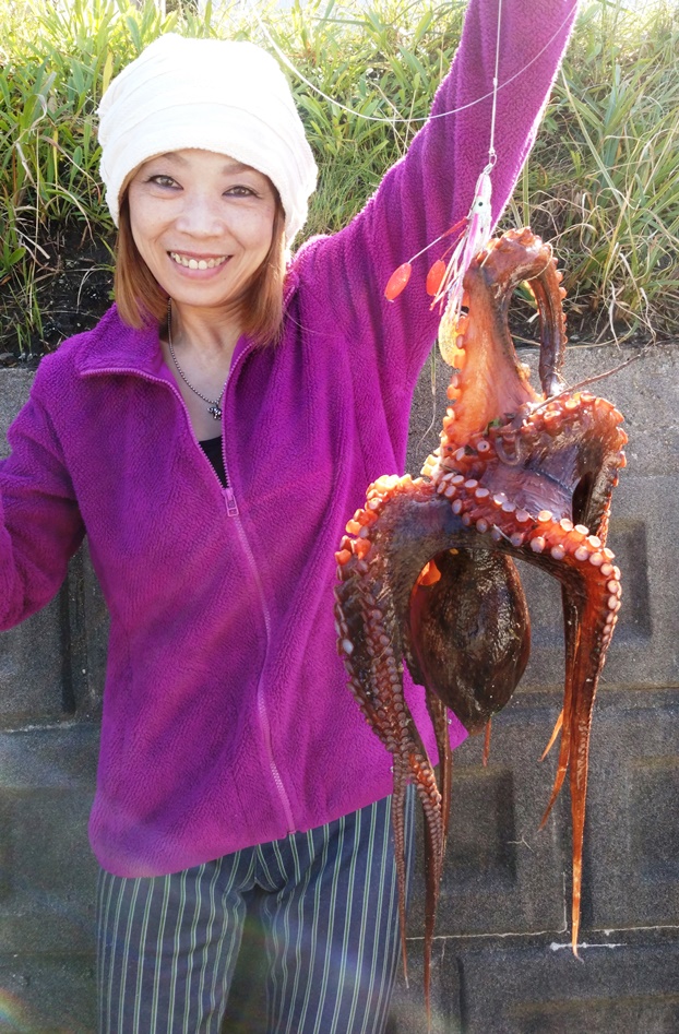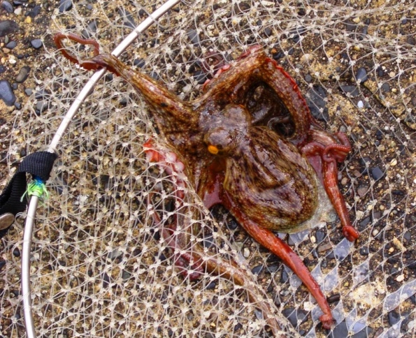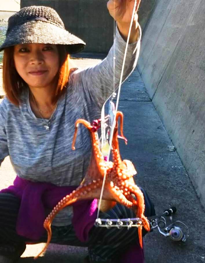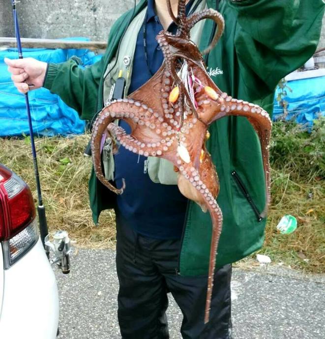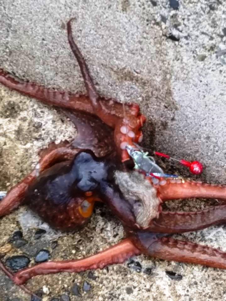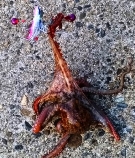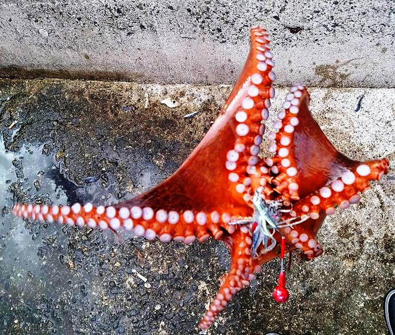 秋が深まると1キロ2キロ(最大4kg)と大きくなってくるので水面で落ちないようにタモが必要になる。タモ網無しではバラシが多いです。実際3.8kgの大マダコを釣った人もいる。