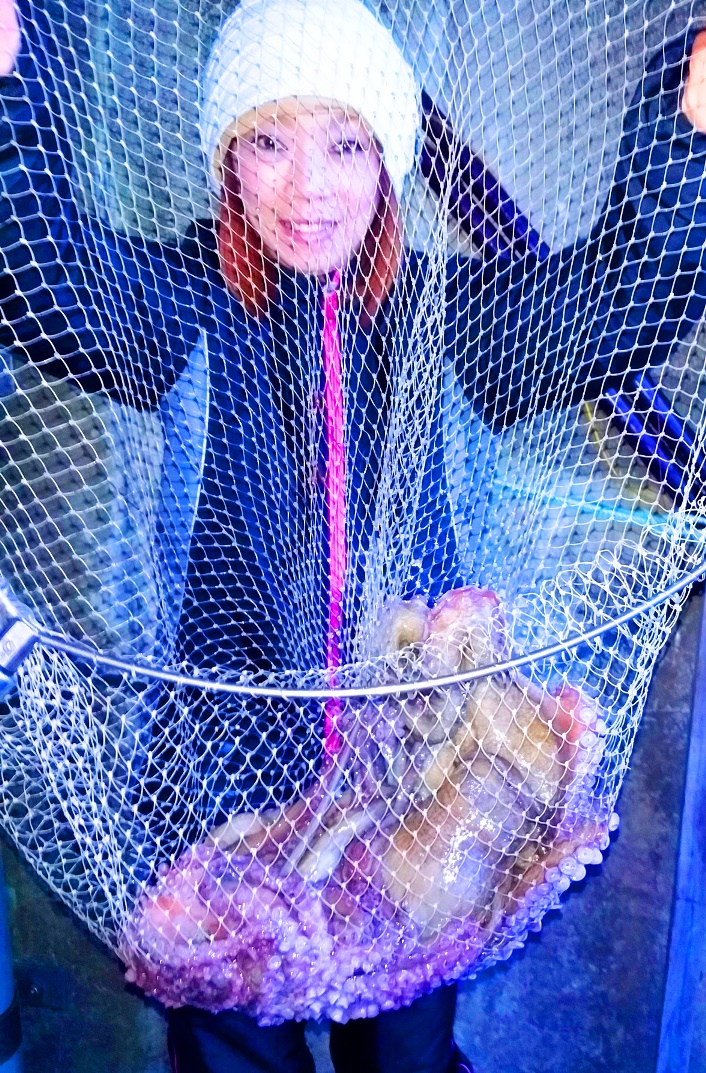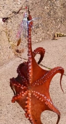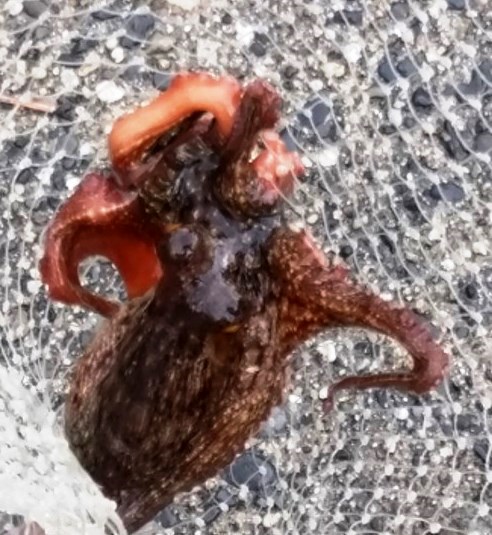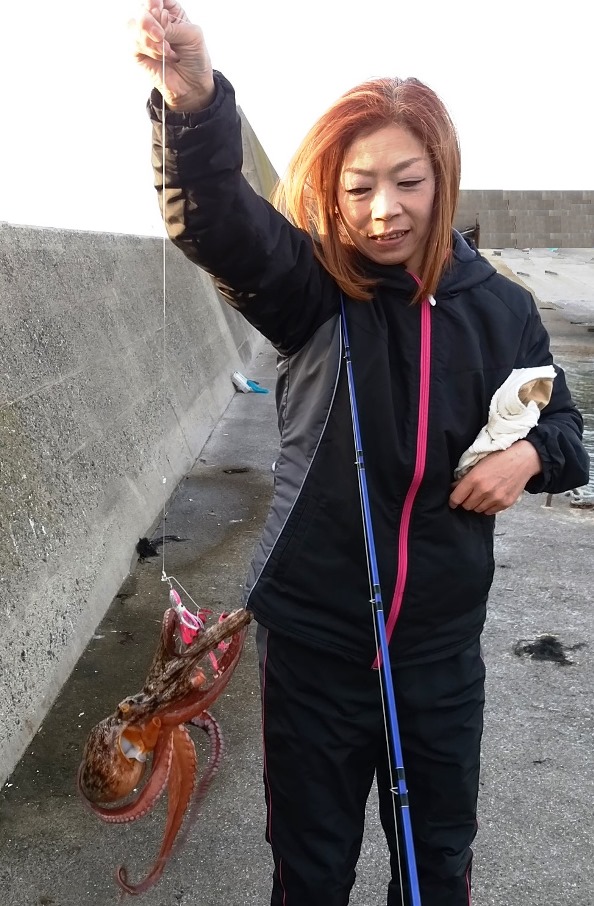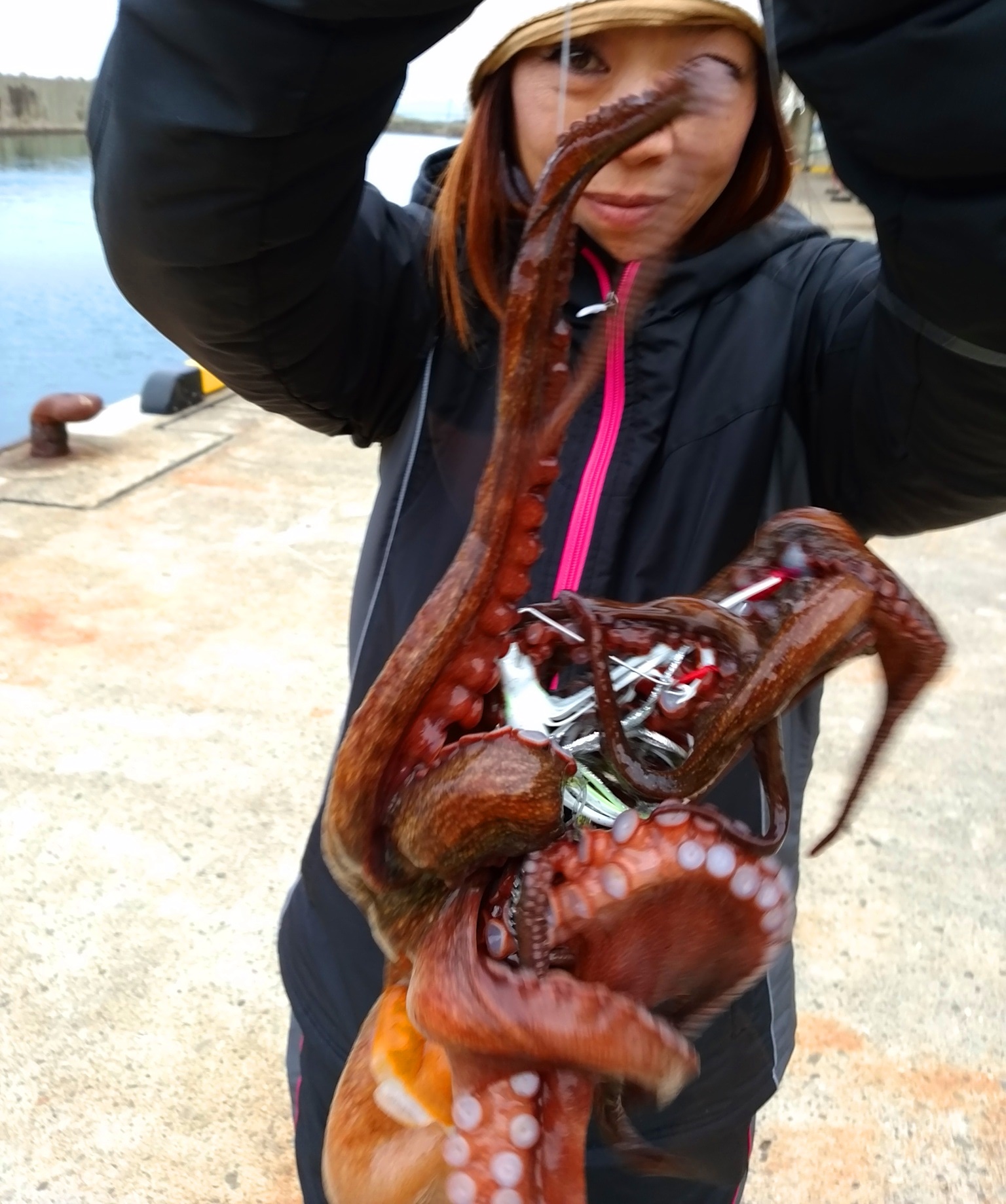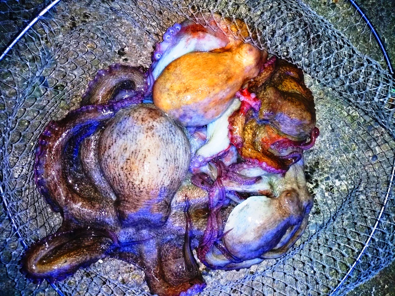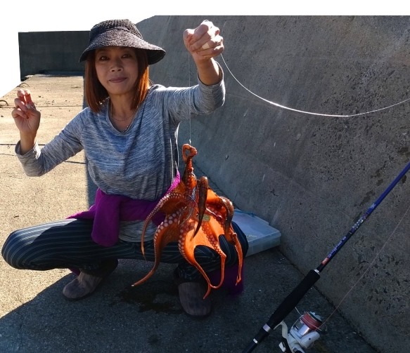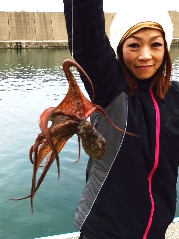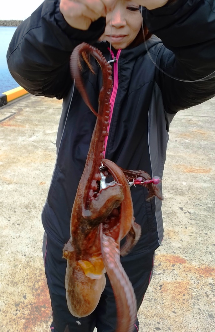 秋が深まると1キロ2キロ(最大4kg)と大きくなってくるので水面で落ちないようにタモが必要になる。タモ網無しではバラシが多いです。実際3.8kgの大マダコを釣った人もいる。