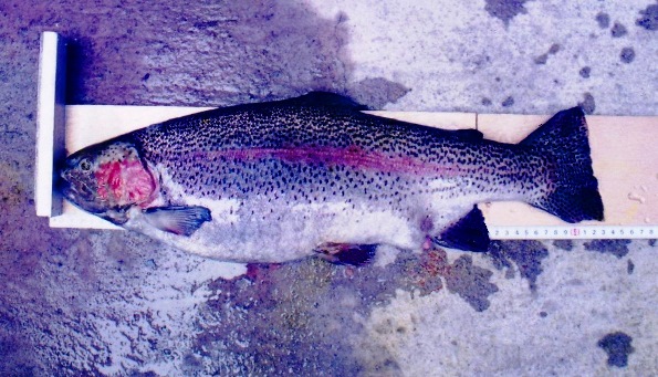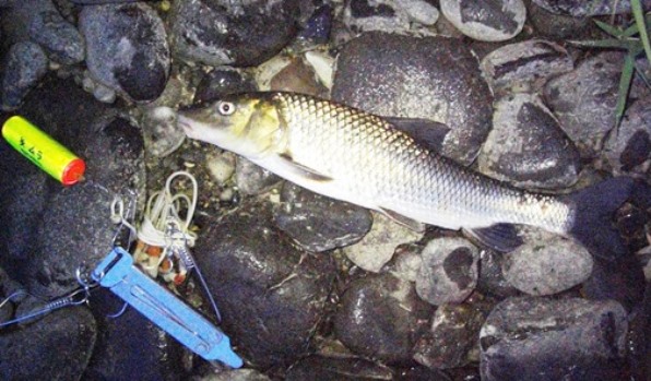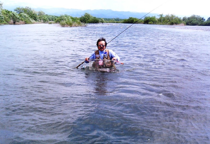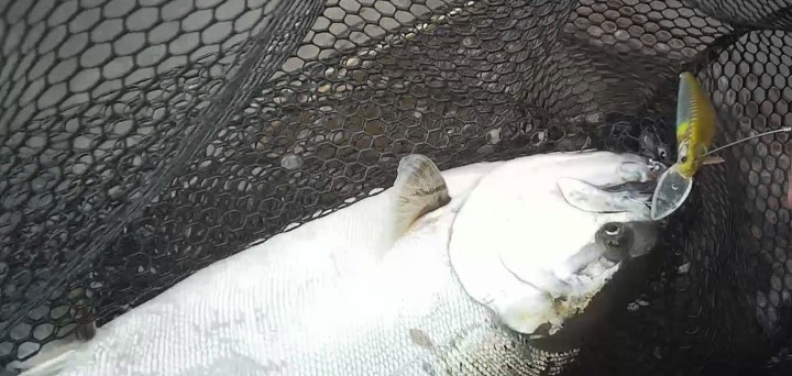 ヒット後は、このぐらい大型になると小刻みにバタバタブルブル走り回る50cmクラスのような忙しいが軽い引きではなく、重々しい鯉のような引きですが、持久力は半端でなく気を抜くとかなり下流に走られますのでドラグを1.5kg設定以上にして置いて水面で必要以上にバタつかないようロッドを倒し気味にして横のポンピングで注意深く寄せてきます。