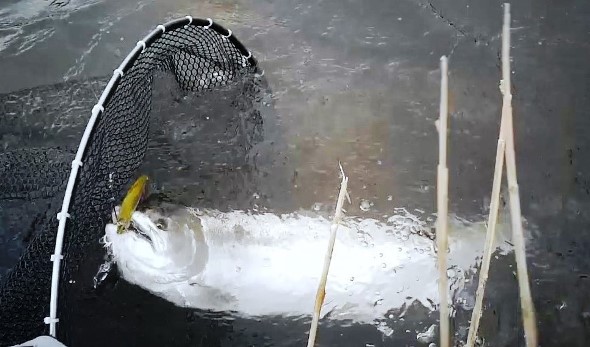 目の前まで寄せて来てもランディング寸前で突然走りだしたり、大きな振幅でバッタン、ザッパーンとロッドごと引っ張るように大きな首振りをして頭が下に向くと更に潜る時があるのでドラグを必ず緩めて鈎が外れたりラインブレイクに備えて置く事です。この時もやはり遊動フックシステムでサスペンドの