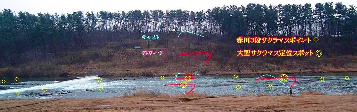 低水温時、河口から下流部までの釣りは特殊ですが河口での宝くじ的ヒットや通過中のサクラマス以外は下流部とはいえ束の間のショートステイポイントがあります。かなりの低水温時はもう少し緩流帯に休んでますが、そんな時はどうせ釣れません。ヒット率を上げるには悪条件や悪天候の時に無駄な釣行はしない。何とか活性がある時は流れに変化のあるところ、ストラクチャーのあるところがヒットポイントです。中でも流れが集約して三角が出来ている瀬尻の頂点から下流の波が消えかかって少し開いたところ。ここが大型サクラマスのショートステイスポットなのです。これは赤川で言えば3段から河口までの間に私が数えると毎年10箇所前後(年によって底が変化するので変化します。)あります。たとえば代表的3段ではこんなところです。○は全てポイントですが、特に◎のところが大型サクラマスの定位場所です。この大型サクラマスショートステイスポットは水量によって大きく前後に移動し、小さく左右に移動します。