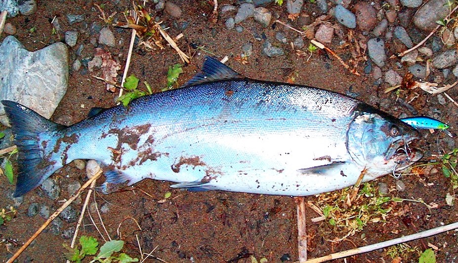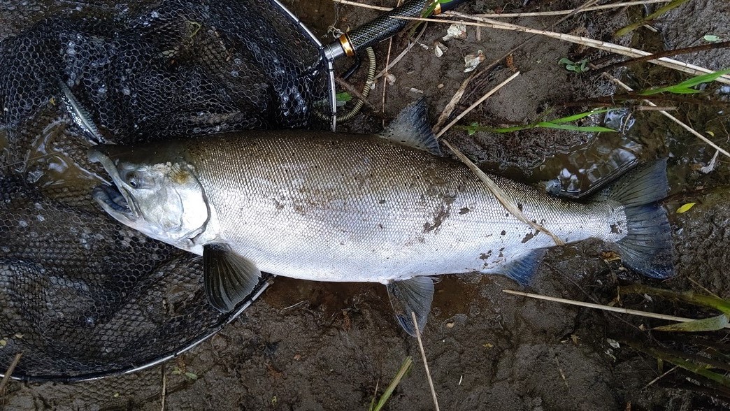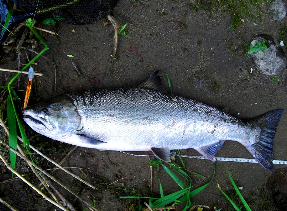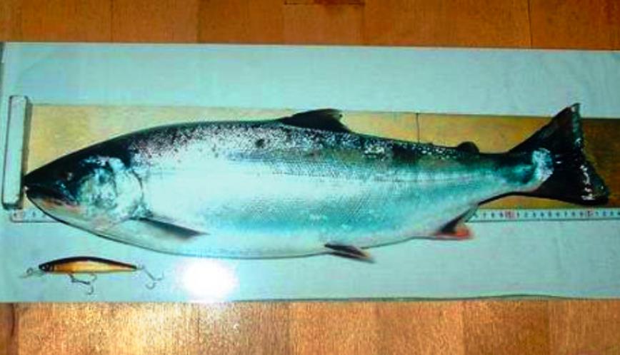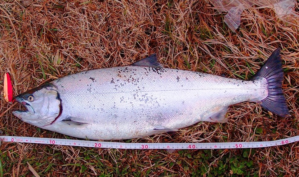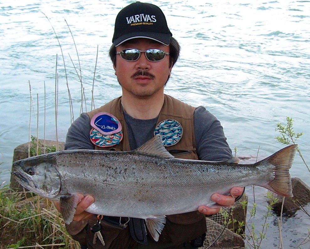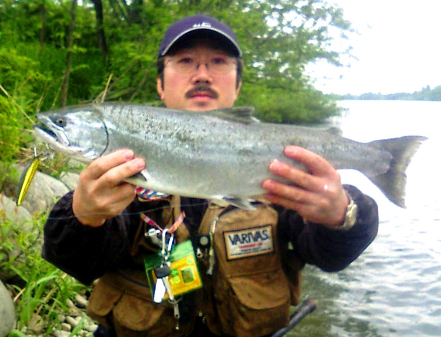 体長1m12cm体重20kgのキングサーモンも確実に遡上している最上川水系やかつて最上川の支流だった赤川では何があっても不思議は無い。私も2度赤川下流と中流でサクラマスではないサーモンor巨大トラウトをセットフックさせているが手に負えなかった。釣友も2時間のファイト後にラインを切られている。現在はいつ得体の知れない魚が来ても↓のようなキングサーモンが来ても何とかOKのタックルで臨んでいる。