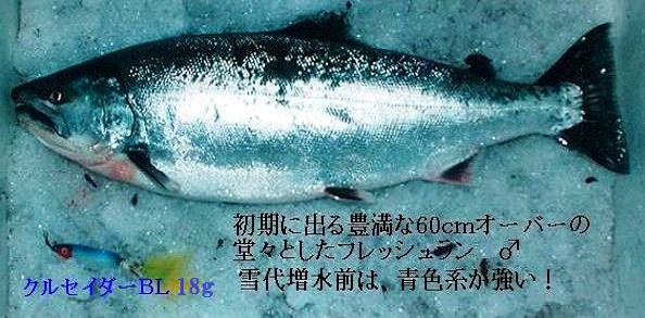 これまで色々なサイズのサクラマスを釣って来ました、仲間や他人の超大型サクラマスのヒットも見てきましたが、50cmクラスの中型サイズ〜60cmぐらいの平均的なサクラマスは特に条件と言うものを感じた事はありません。一時まだ未熟な時に潮の干満とヒットは関係があるとか大潮の時が良いとか関連付けて考えた事はありましたが、河口部では多少あるのかも知れませんが、中流ではもちろん下流部ですら潮と関係ないヒットが多く見られるようなので、先入観と言う観点から見てもマイナス要素はあまり気にしないほうが期待感を持って釣りをする上で良いではないかと思うようになりました。みんな自分の釣行日が大潮の日は今日は良いかもと都合よく考える事は悪い占いは見ないで良い占いだけを信じるようなものでポジティブな考えとして正解だと思います。