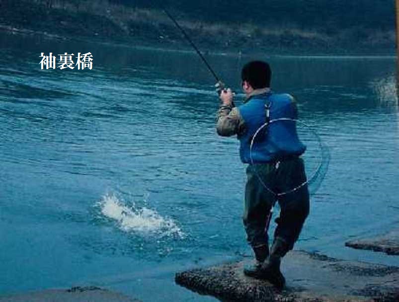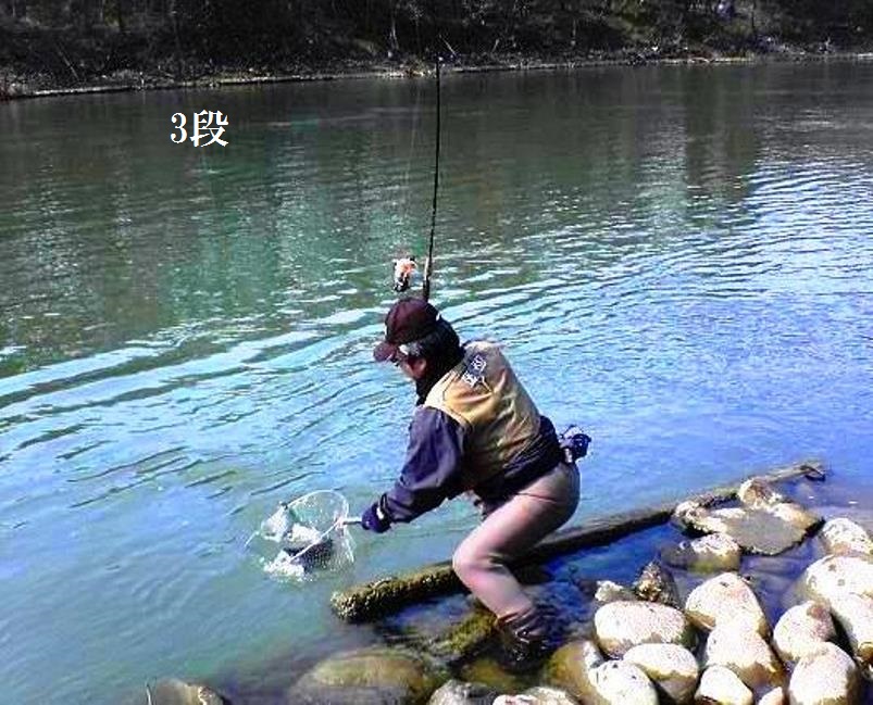 ここはかなりの水圧が掛りますからヒットしたら走らせないでガンガンポンピングして釣手側に頭を向かせないと下流に走られ長いファイトになりバレが多くなります。何とか手前まで寄せたら逆に冷静に走りに備えラインブレイクや口切れを防ぐ為ドラグを緩め緩流帯に引き込み弱るのを待ち、抵抗する動きが止まり一瞬でも横になったら素早くランディングします。