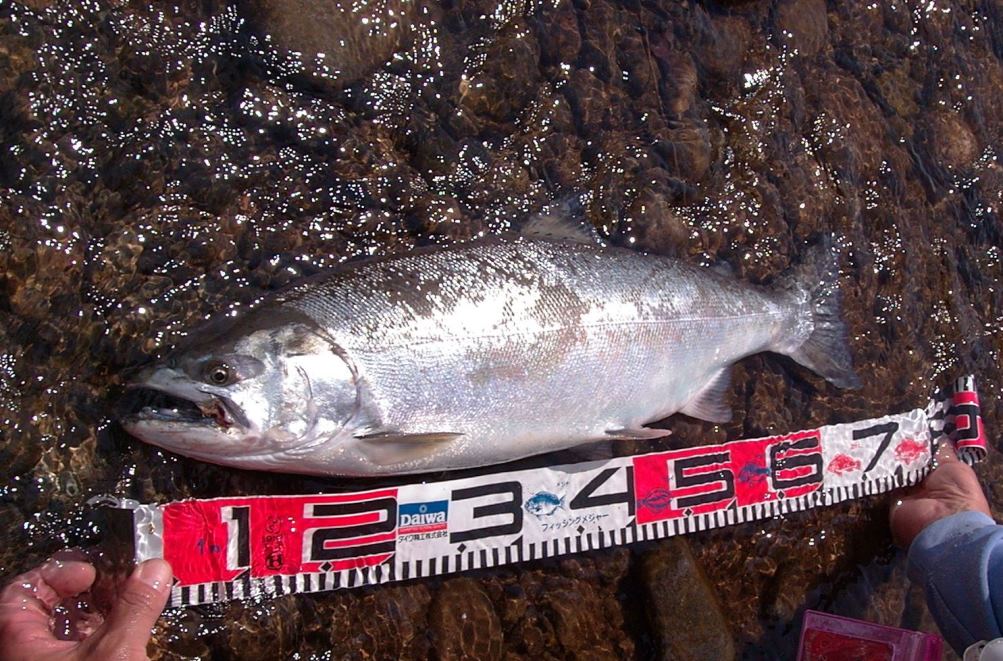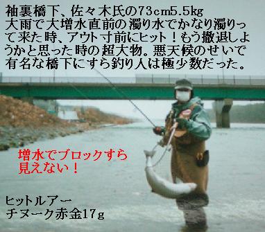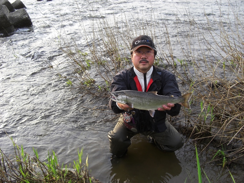 しかし、70cmクラスの超大型サクラマスには釣れる条件と言う物があるように思います。それは気圧の谷が通り大荒れの天気に成り掛けていて泥濁りになる寸前や泥濁りからの澄みはじめと言う他の釣り人があまりやっていないホンの短い時間帯が確率が高く超大型サクラマスの70cm前後がヒットしている感じです。私の70cmも大雨で笹濁りが強くてランディングした後も断続的に降る雨で、濡れると壊れ易いデジカメを出すのがためらわれたぐらいでしたし、釣友の佐々木氏の73cmは更にひどい天候で泥濁り寸前での撤退覚悟の時に出た起死回生の超大物サクラマスでした。もっとも確率だけの問題でピーカンの渇水でもヒットはしていると思います。