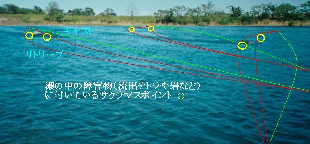 6月、気温が上がり、更に水量が日々減ってくるにともなって水温が上昇して来ると大岩魚やサクラマスは朝夕はトロ瀬やリフルに居る事があっても日中は荒瀬尻から荒瀬の中まで入ってくるか、日の当たらない木陰や岩盤の溝、流れの当たるテトラや大岩の際に付いている例が多い。こうなると広範囲を攻めるU字ターンや横からのアプローチではテリトリーのあるステイスポットを通過する時間は一瞬にしかならず、深追いをしないこの時期の日中ではヒットは望めないものです。