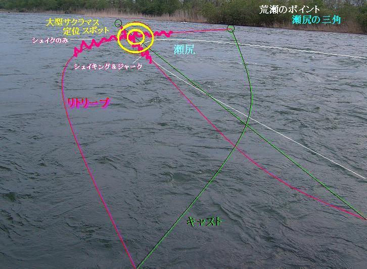 この時期こう言うところは圧倒的にスプーンで釣った方が有利です。迷う事はありません、この三角の頂点に当たる地点の右岸か左岸にキャスト位置を確保し、三角の頂点より上流に向けて水量により底を取れる重量のスプーンを打ち込み三角の頂点で底を取れるように調整し、底に着いたらそのままラインスラックだけを巻く感じでリーリングすれば、サクラマスが居るなら間違いなくヒット!